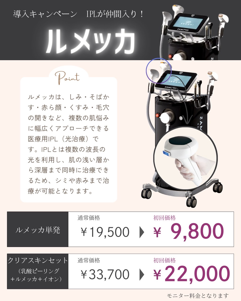 しみと赤みに強い光治療(IPL)ルメッカを導入しました。